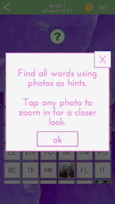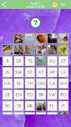Guess the hidden word using a photo for a hint, the words are divided into letters, riddles of varying complexity, from simple words, which take seconds to solve, to complex words, which will take a lot of time to solve.