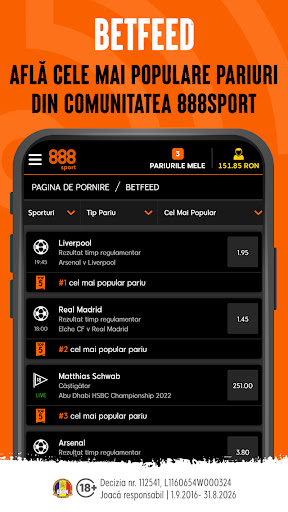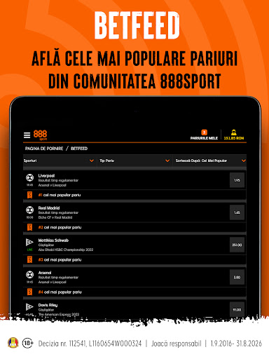 • BetFeed – Vezi care sunt cele mai populare pariuri în cadrul comunității 888sport și urmărește pariurile pe măsură ce apar, în timp real, cu fluxul live al 888sport.