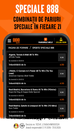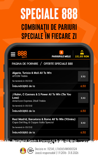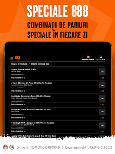 • 888 Speciale – În fiecare zi vei găsi cote mărite pentru o gamă largă de sporturi, cu o multitudine de multiple îmbunătățite și pariuri speciale pe care să mizezi. Vei avea de unde alege - așa că selectează-ți pariul câștigător!