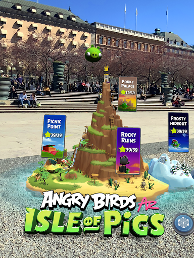 Join Red, Chuck, Bomb, and the Blues to rescue the stolen eggs in Angry Birds AR: Isle of Pigs, a mobile adventure enhanced with Augmented Reality (AR)! Explore the secluded island where the avaricious green pigs take their vacations through more than 70 levels filled with fun challenges (with more to be added soon!). The AR technology lets you view the amazingly authentic characters, as well as the overall game, superimposed onto your immediate surroundings, providing you with an extraordinary Angry Birds experience. Make your way up to the city of fun by traversing the island's jungle, desert, and icy base, demolishing the pig's constructions in the most fascinating way possible, racking up the highest number of stars, and recovering the pilfered eggs.