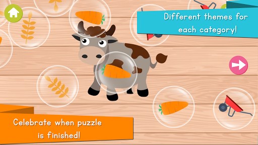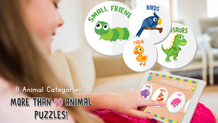 This puzzle game for kids helps your kids develop matching, tactile and fine motor skills while playing more than 90 different Animals Puzzles in 8 categories - safari, farm, forest, sea, birds, small friends, sea 2 and dinosaurs. The game includes animations, pronunciations, sounds of animals and interactivity for easy learning. It will teach your kids all animals and yet you will never be worried about them losing any piece of the puzzles! No more cries and missing pieces!