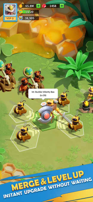 Don't want to wait for slow upgrades? This won't happen in Beedom! Whether you're upgrading soldiers, buildings, or decorations, you can always level up immediately using the merge system!
