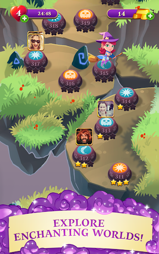 Whether you indulge in Bubble Witch 3 Saga alone or engage with your friends, you’ll find that this fascinating game bursts with an array of features to keep you entertained. Rebuild Stella's home by blasting bubbles, and work your way through puzzle levels that will challenge your advance bubble bursting skills. Join forces with the star cats and explore an adventure packed full of mystical creatures. Help Stella as she strives to save the magical creatures, or take them on if they get in your way. The puzzles are increasingly challenging and future creatures come with new bubble matching rules, making it an exciting and entertaining experience.