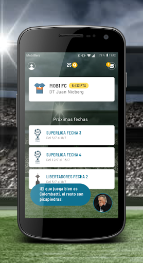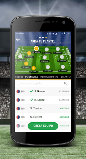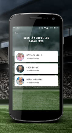 Caballeros del Fútbol es una aplicación en la cual podrás crear tu propio equipo para desafiar a los famosos "caballeros": Coco Basile, Mostaza Merlo y Horacio Pagani.