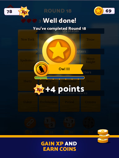 Every Round or Daily Challenge you play earns you more Points and more Coins. Earn even more Coins for each Level you complete. Coins allow you to buy Hints, which help you if you get stuck on a challenging word puzzle!