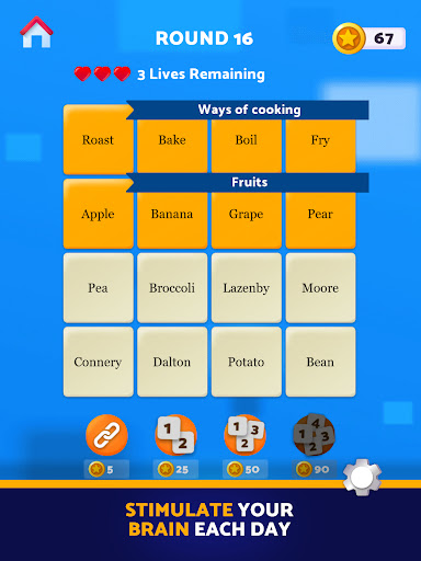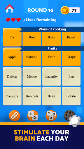 The game is designed to stimulate the brain with exciting word categorization puzzles and provide a fun and engaging daily activity. The only word connections app of its kind!