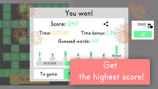 Enjoy infinite brain-teasing challenges with multiple difficulty levels! Think wisely, you can help yourself by solving intersecting words! Don't use too many guesses and be as fast as possible to reach the top! Master the art of strategic thinking!