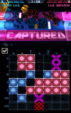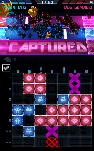 In the world of Crystal Clash, you are the lord of your castle, and your soldiers, called "Bits", assist you in expanding your territory. Both you and your opponent simultaneously solve the same set of pixel logic puzzles, and with each correct fill, your Bits automatically advance and attack your opponent. Decide the best strategy for your Bits by controlling the lanes they attack on -- either keeping your defense strong, or pushing them all for a full attack to claim your opponent's area.