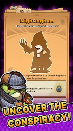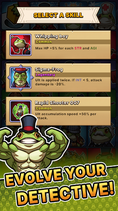 You are Mr. Froggs, a renowned investigator cursed into a toad by a secret cult. As you progress, you’ll unlock regions, fight enemies in AFK battles, find clues, and choose from random skill sets to evolve your crime-solving style.