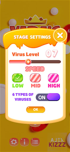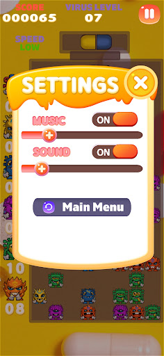 You can choose difficulty by setting game mode, level of viruses' count and falling speed of the pills in settings menu at the start of the game. Low speed gives you x1 points, Med speed has x2 multiplier and High speed has x3. More viruses you kill by one combination - more points you get. Try to get as much points as you can to reach higher your place in the scoreboard. 🏆 But don't forget to sign in to see leaders.