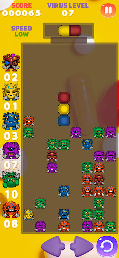 You can manipulate each capsule of pills 💊 as it falls, move this capsule left ⬅️ or right ➡️ and rotate 🔃 it at the same time. You can see which colors of pills will be in the next capsule. To kill a virus you need to match four or more pills or viruses of the same color in vertical or horizontal line💊💊💊😈, after that they are removing from the jar❌😈. Your goal is to kill all the viruses in the jar. But if you fill the jar up with pills to the very top - it is game over and win of the virus.🚫