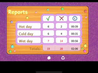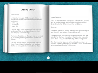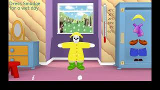 Smudge has a whole wardrobe full of clothes. Children can scroll through the wardrobe and select suitable items for the weather conditions and drag them onto Smudge. When all the items for the type of day have been put on Smudge, she will perform a rain dance, drink her cold drink or shiver in the cold! There is help which shows the items Smudge still needs to put on for this type of weather.