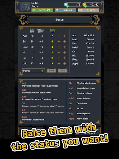 You can freely set AGI, STR, DEX, VIT, INT, and LUK to develop into your favorite hero.