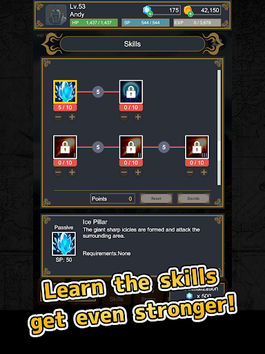 Use the skill points granted each time you level up to acquire skills to advance in battle.