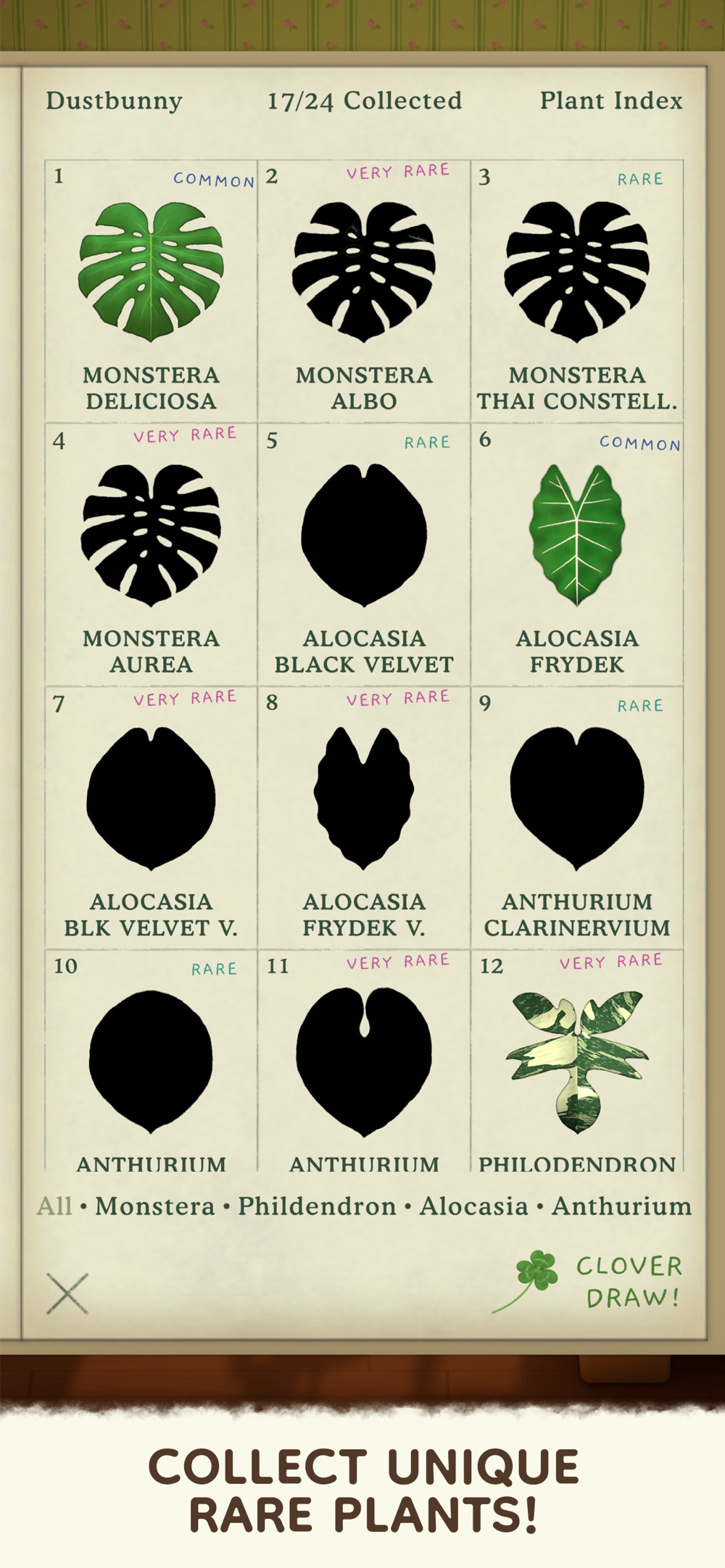 Your journey of self-discovery begins as you collect dustbunnies and Emotibuns, the bushy, timid critters that camouflage themselves as dust bunnies and represent your repressed emotions such as despair, fury, apprehension, solitude, and emptiness. With your keen eyesight and quick fingers, you must catch them before they scamper away. Once they express their feelings, they flourish into charming houseplants, including the uncommon unicorn plants. You bestow them with a unique name and an ID card that tracks their evolution as you attend to their needs, like misting, watering, pest control, and other TLC tasks.