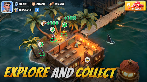 Construct and upgrade shelters at sea, gather and produce resources, and strengthen your base defenses.