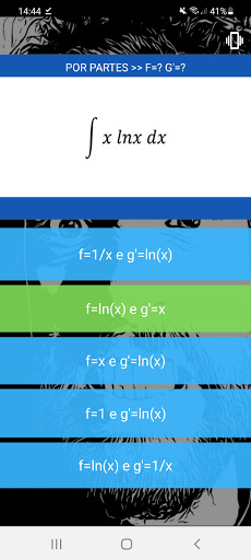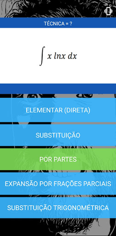 a) Flashcard: Nesse nível, é apresentada uma integral e o jogador deve acertar o tipo de técnica de integração a ser utilizada. Caso um determinado problema possa ser resolvido por mais de uma técnica, deve-se adotar a opção que aparece primeiro na lista. A cada rodada, um jogador coloca (automaticamente) uma de suas cartas na mesa e, caso o jogador acerte a técnica de resolução, a carta permanece na mesa. Caso o jogador escolha a opção incorreta, ele pega todas as cartas que estiverem na mesa. Ganha o jogo aquele que conseguir ficar sem nenhuma carta na mão, acertando a técnica de resolução dessa última carta que estava em sua mão.