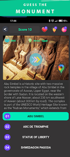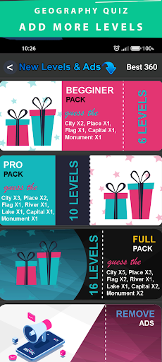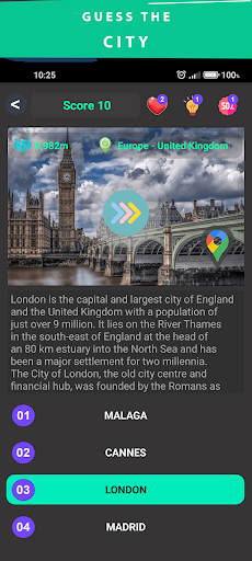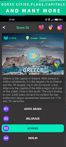 Quizzy is an entertaining quiz game aimed at geography. The game is in the logic of Guess the... In general, two or one picture with four possible answers are displayed and the player is asked to find the correct answer. Each level completed by twelve questions.There are a number of categories to guess, such as the city, place, flag, capital, monument, river, lake. The game consists of 21 levels, 5 of which are free and the rest are available through the Quizzy shop in three different packages.