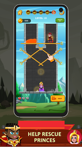 In Hero Rescue, you'll aid the hero in his mission to rescue the princess from imminent danger. Solve intricate pin puzzles by pulling the pins and complete each task. Rescue the princess and search for treasure that will make you the richest hero in history.