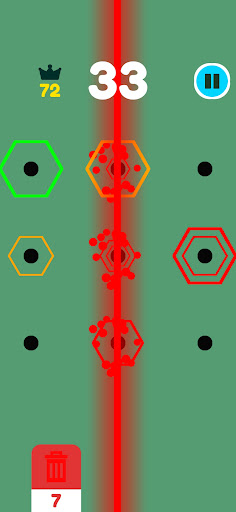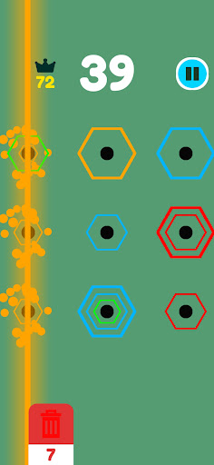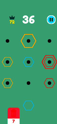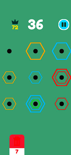 - Arrange hexagon of different sizes and colors on a puzzle board. Creating a 3 hexagon line of the same color, regardless of size, will clear them and grant points
