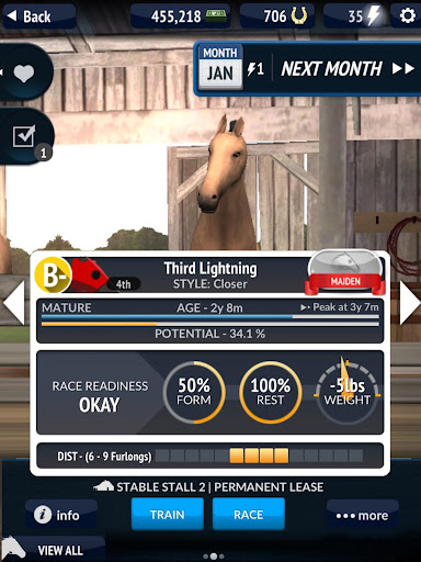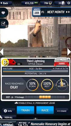 Manage a robust and efficient stable to raise your own thoroughbreds. With food, rest, and physical training, boost your horse's performance stats. Strategize training routines that vary in surface conditions and exertion levels to improve and upgrade their stats. Only the best owners know how to maintain peak performance in their horses.