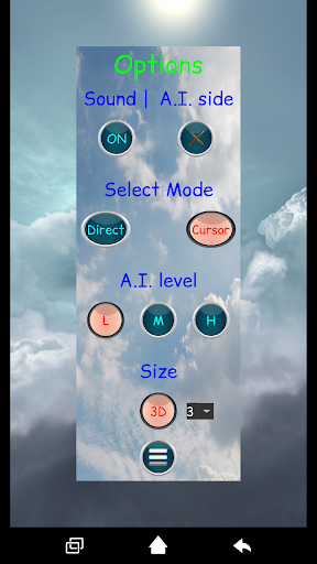 - Settings can control A.I. plays cross/circle, level of A.I. algorithm (Low/Medium/High), size of the board from 3 up to 8