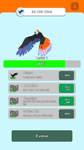 Evolve mutations of each species to get more DNA points! Eat other birds to evolve and become different. How far can you fly?