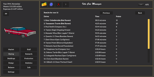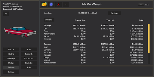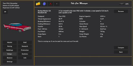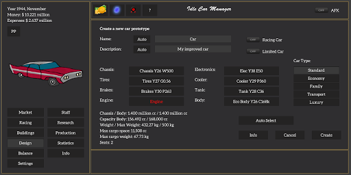 You can design, customize and research car parts to build your perfect car. But be careful, if you make mistakes your company might go bankrupt!
