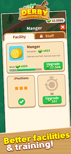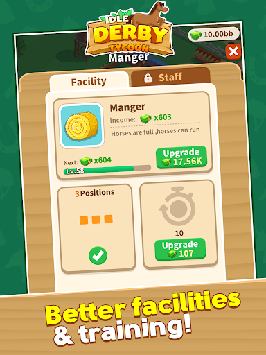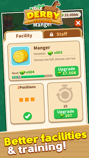 By placing different facilities and equipment, you can improve the attributes and abilities of your horses, making them faster, stronger, and more durable to win races. You can also continuously improve your horse farm by unlocking new horses, improving their quality, and upgrading their skills.
