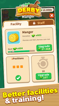 Welcome to "Idle Derby Tycoon", a casual game that combines idle elements and horse farm management.