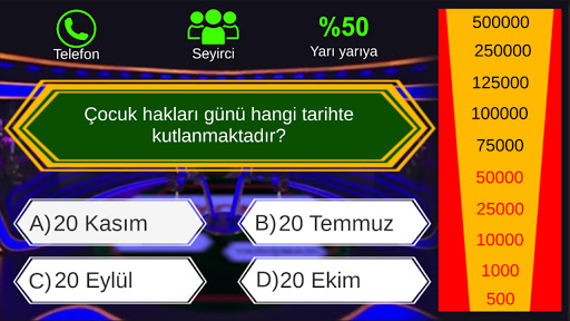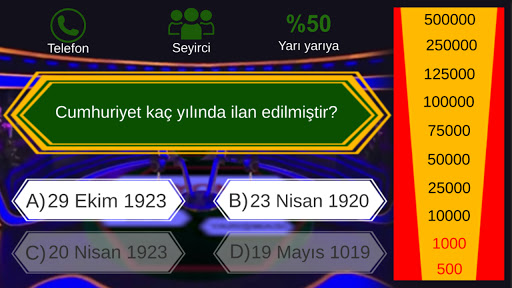 Soruları bil bilemediğinde telefon, seyirci veya yarı yarıya joker hakkını kullan Yarışmayı tamamla.