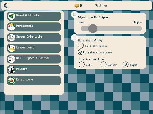 • 2 ways to control the ball: tilt device or use a joystick on the screen.