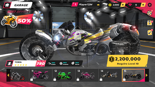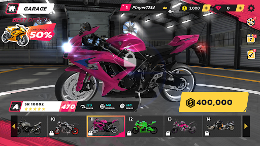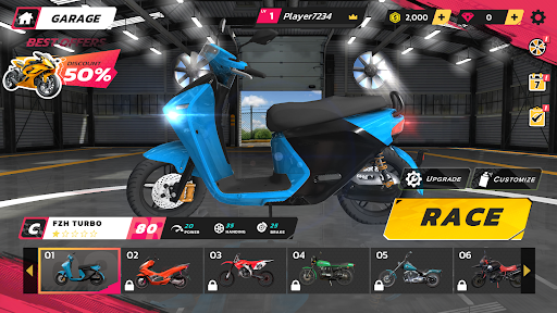 Choose from a wide range of motorcycles, including superbikes, classic bikes, and heavy engine models, each with unique handling and performance. Upgrade your bike, improve speed, acceleration, and braking to dominate the road.