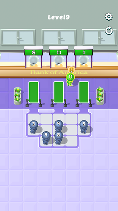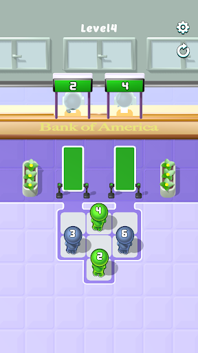 Tap and Match: In Line Up Puzzle, your objective is to match the numbers carried by the customers to the corresponding box office numbers. Tap on a customer with the correct number to send them to the right teller. Tap the customer you brought to the green grid again and direct them to the teller.