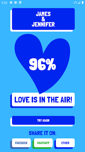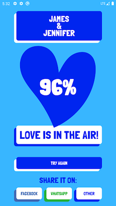 Simply enter the names of you and your potential partner, and our love tester will do the rest! Whether you're looking for love or friendship, our app will give you an accurate compatibility score that you can share with your friends on Facebook, WhatsApp, TikTok and more!