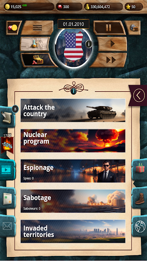 Annex states and kingdoms, send troops to capture resources. Build a fleet, prepare military units, buy or produce military equipment. Erect airfields, arsenals, barracks, and shipyards. Send spies and saboteurs