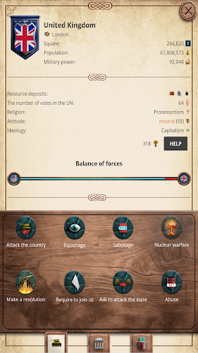 Choose military and economic laws to develop your country. Select the best religion to unite your population: Christianity, Islam, Hinduism, Judaism, Shintoism and more. Pick the right ideology to move your country forward: Capitalism, nationalism, conservatism, liberalism and more.