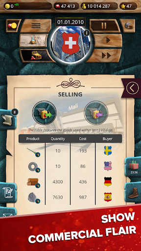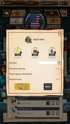 Produce food and extract raw resources for the manufacture of goods. Trade with other countries. Build factories, farms, plants, bakeries, mines, oil derricks and more! Build a thriving country with no shortages. Manage taxes and learn cutting-edge economic researches to optimize your income.