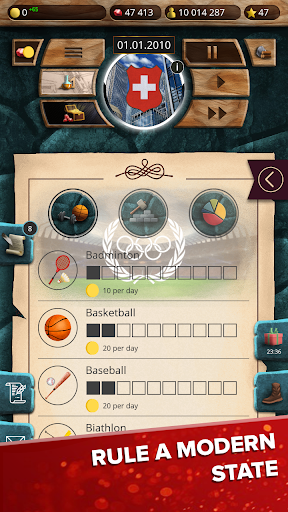 Manage various ministries to make life of your citizens better and safer: police, security service, Ministry of Health, Education, Defense, Infrastructure, Sport, Culture, environment, housing and utilities infrastructure and so much more! You control all the aspect of your country’s life