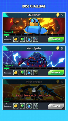 Unlock and upgrade many new mech parts to win battles and rank up in BOOS Challenges. Get ready to equip your mech with the craziest and most powerful weapons! Can you become a challenge master?