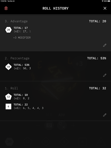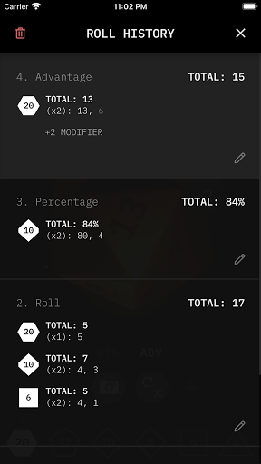 - View a breakdown of all previous rolls made during your current session. Each roll in your history can be quickly rerolled, saved as a preset, or copied in a text based format.