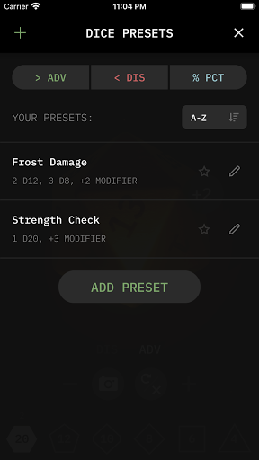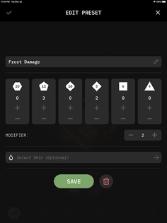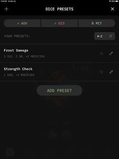 - Save and sort dice presets for your most frequently rolled dice. A preset can include any number of dice, modifier, or specific dice skin.
