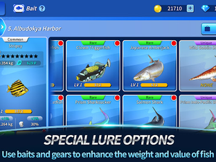 Enhance your fishing gear or collect your favorite options to catch even more spectacular fish.