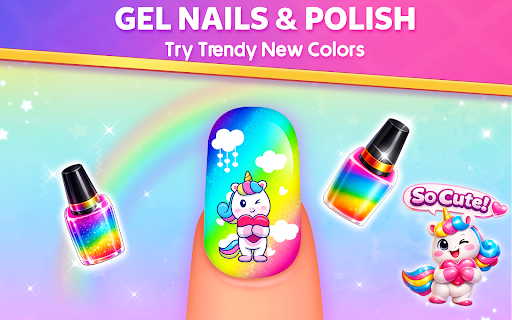 Rainbow🌈 : Embark on a colorful journey with the rainbow nail art game. Paint your nails with vibrant hues of the rainbow, blending shades and creating stunning ombre effects. Let your creativity soar as you design rainbow-inspired nail art that spreads joy and positivity with every brushstroke.