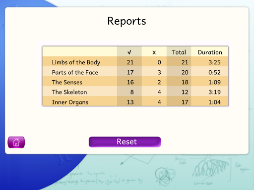 The picture shown on the left side of the screen can be completed by dragging the component parts (ribs, skull etc.) from inside the white box on the right and placing them into position on main picture. When all of the objects have been placed, a number of labels will be shown, which can be added onto the picture in a similar way. All of the children's tries will be recorded, and the total number of correct and incorrect answers can be viewed.