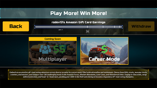 Off-Road Champion introduces an innovative reward system that offers the chance to win real cash, crypto, or Amazon gift cards. By dominating the competition and consistently outperforming your opponents, you can earn valuable rewards that go beyond in-game achievements. Let your off-road skills pay off and enjoy the thrill of competing for tangible prizes.