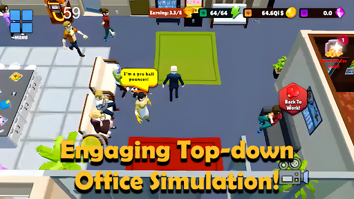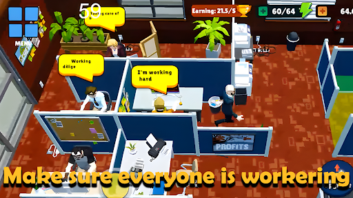 Immerse yourself in this engaging top-down office simulation game where you have the power to manage your workspace, hire employees, and watch your business thrive.
