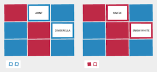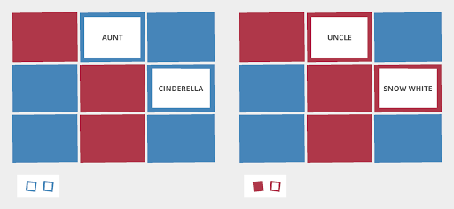 Tic-Tac-Toe - Each team's clue giver is presented with a tic-tac-toe board filled with 9 words. Claim a square as your own by getting your team to guess your word before the other team blocks you by guessing theirs. The first team to get three-in-a-row of their color wins the round.