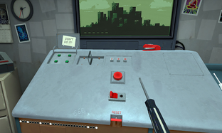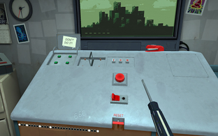 Covering for a colleague taking a bathroom break, you find yourself in front of a mysterious console with a green screen monitor showing a pixelated live image of an unknown city. Also present is an ominous red button with the simple instruction to not touch anything!