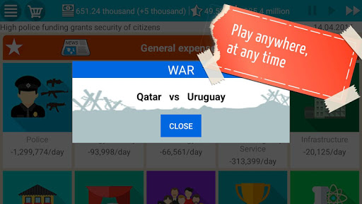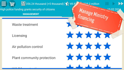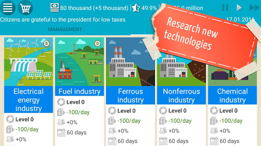 Prove it! The "President Simulator" game lets you rule one of the 163 modern countries. Politics, the media, espionage, natural disasters, wars, taxes, crime fighting… Show your strength, wisdom and perseverance. Build a superpower that dictates its rules, otherwise the world will smash your country.